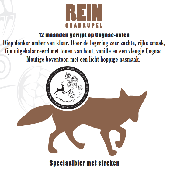 Onze prachtige Rein hebben we maar liefst 12 maanden laten rijpen op Franse eikenhouten Cognac vaten! Daardoor heeft het bier heerlijke aroma’s van karamel, geroosterde amandelen, tonen van honing, vanille, gedroogde rozijnen en een vleugje hout gekregen. Heerlijk zacht en vol van smaak, wat een geweldige beleving! Geniet ervan!